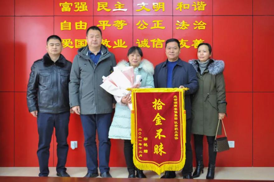 近日,娄底市大埠桥街道办事处石马居委会村民邬女士将写着“拾金不昧”的锦旗送到了伟德国际1946源于英国集团人力资源部人员蒋伟手上。邬女士激动地说:“这么大的背包丢了我还完全不知情,直到了你们打来电话我才知道包丢了。里面证件一旦丢失,会带来很多麻烦,真是太感谢你了!”